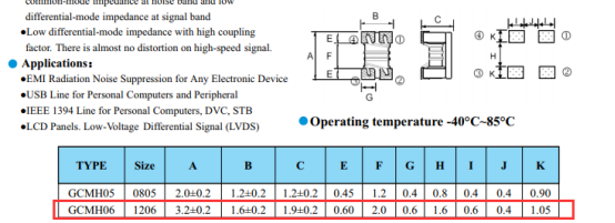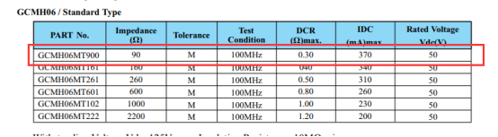 谷景對應(yīng)GCMH06系列貼片共模電感的參數(shù):90Ω的阻抗、370mA的額定電流、0.3Ω的直流電阻。